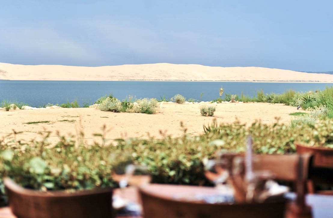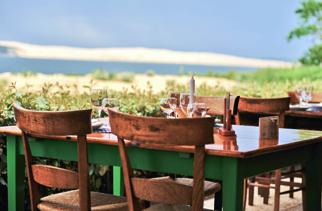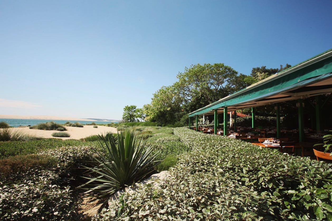 Une terrasse légèrement couverte à la façon d'une tonnelle fait face au monument de sable de l'autre côté du bassin : la dune du Pilat. De grandes tablées où l'on vient partager des turbots, des bars pour 6, 8 personnes, mais aussi des soles, du thon et autres pêches du jour. Les moules au jambon dont la recette se transmet depuis plusieurs générations se dégustent avec les doigts et sont servies avec des frites maison. La maison est connue aussi pour l'accueil de Bernadette Lescarret, petite fille d'Hortense qui ouvrit le premier restaurant dans les années 1930.