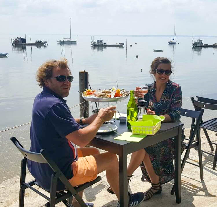 Adrien vous accueille sur une terrasse nichée au bout du village ostréicole de Claouey sur la Presqu'île. Dégustation d'huîtres au bord de l'eau accompagnée de citron, pain beurre et servie avec un verre de vin blanc frais de Bordeaux.