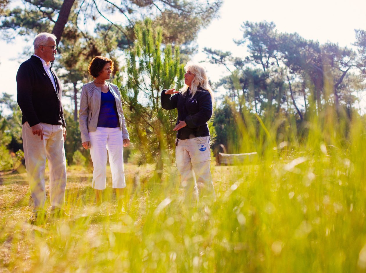 Une balade à pied de 2 heures, en groupe ( max 25 personnes), permet de comprendre, de découvrir, les caractéristiques des paysages de ce site directement, liées aux activités anciennes : pisciculture, gemmage des pins et exploitation de bois d’œuvre.