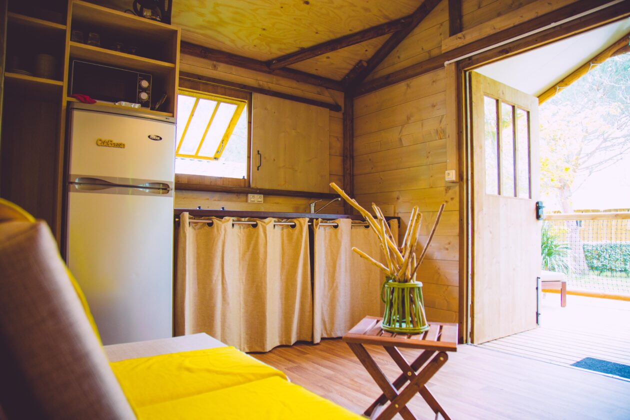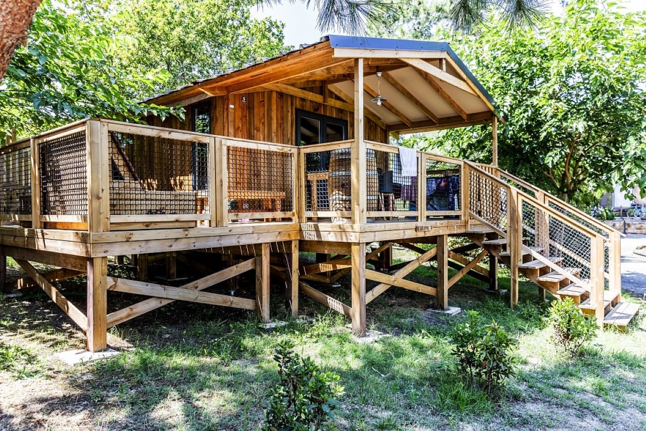 Aux Couleurs du Ferret propose bien sûr des mobil-homes classiques, mais aussi de jolies cabanes sur pilotis ! Le matin, on prend plaisir à petit-déjeuner sur la terrasse, avant d’enfourcher le vélo pour une balade sur la piste cyclable de la Vélodyssée, ou en direction du Bassin d’Arcachon (4kms).