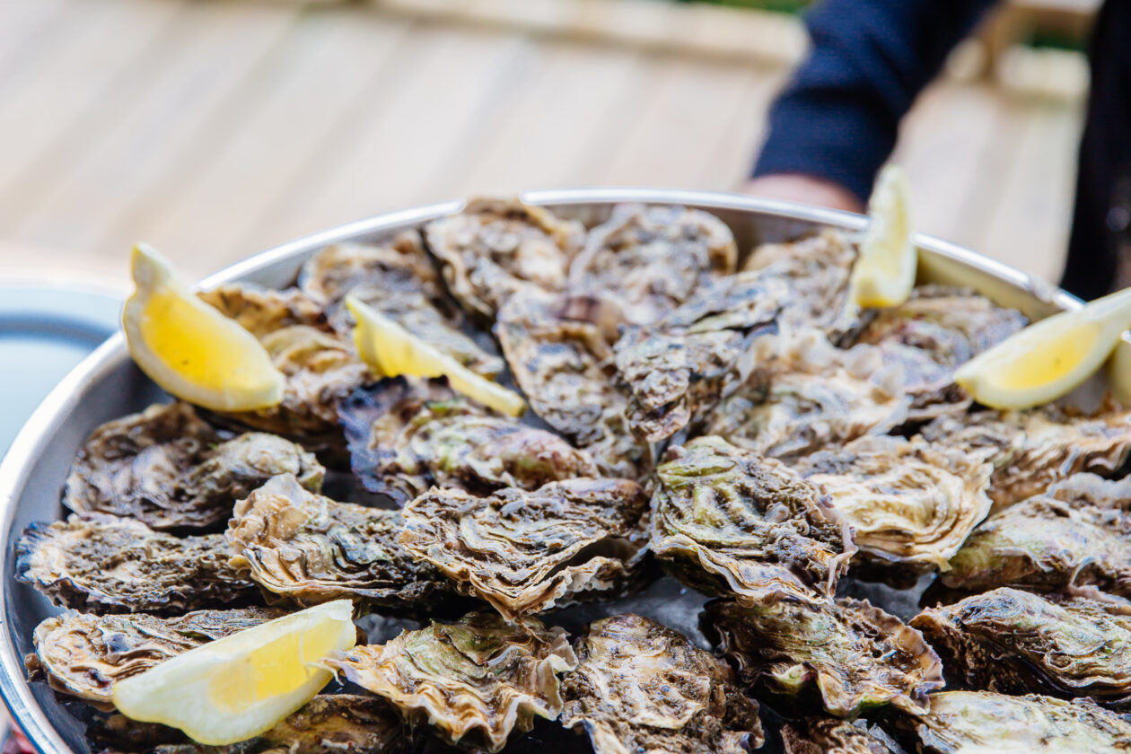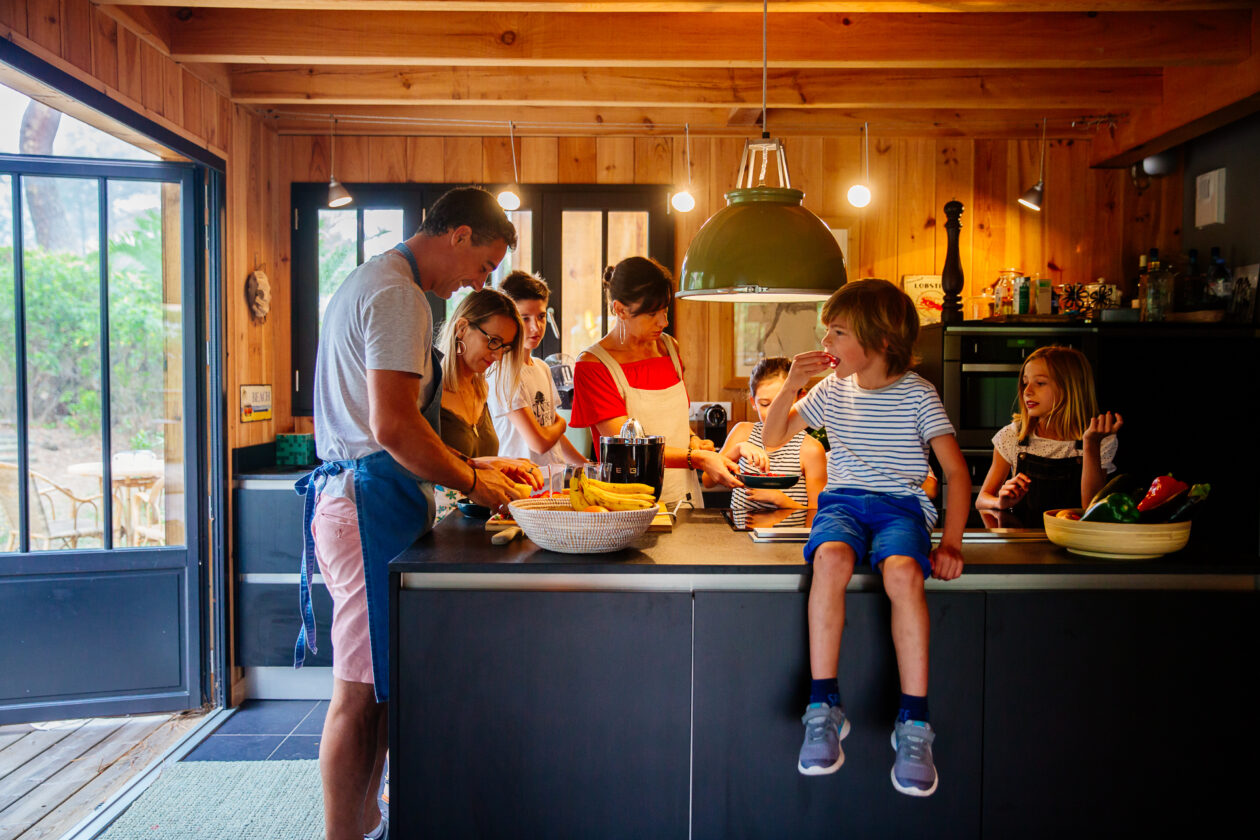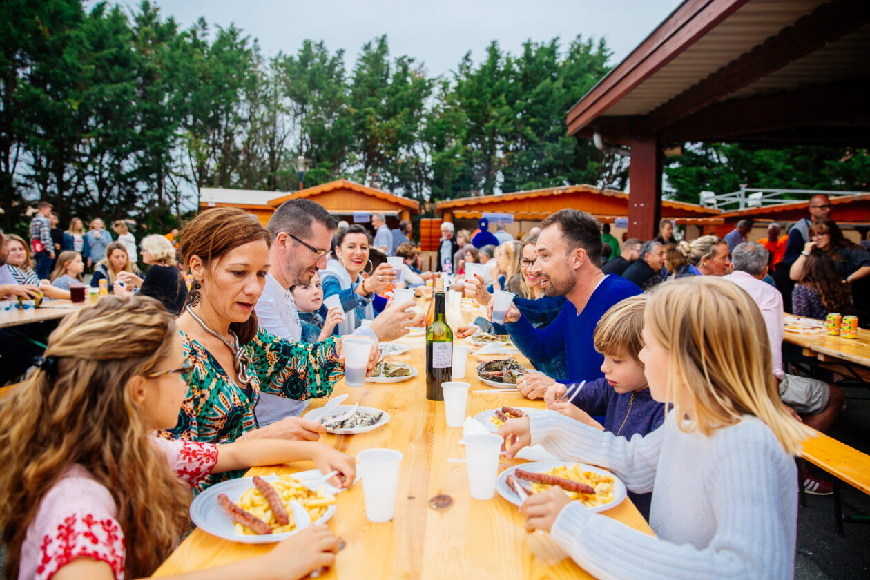 Avant de nous attabler, nous passons une tête en coulisses où toute l’équipe s’affaire à griller les saucisses, ouvrir et chauffer les huîtres, frire les frites, roser les magrets. Les petits en ont l’eau à la bouche, autant que les parents, mais eux n’osent pas le dire !