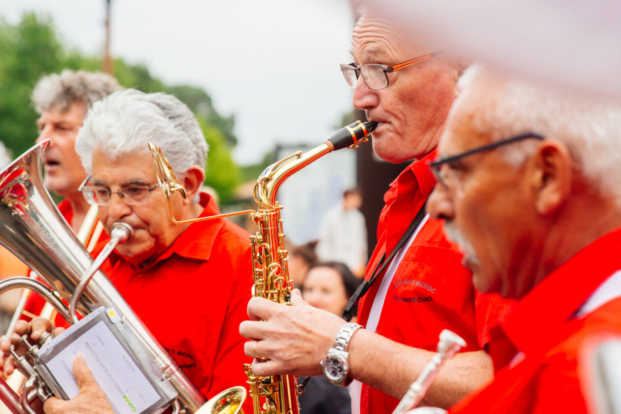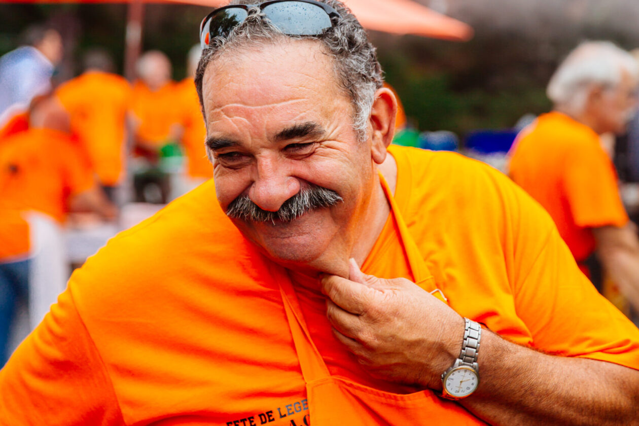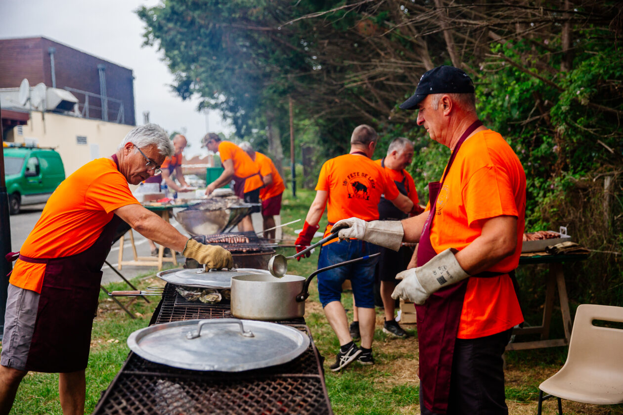 Attirés par la musique des bandas du Sud-ouest, tout le monde se dirige vers la place du village dominée par l’église. Comme chaque année, le repas est organisé par l’association des chasseurs du coin, reconnaissables à leur t-shirt orange et leur bonne humeur.