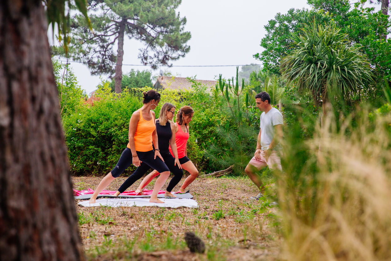 Les enfants dorment encore, le soleil reste timide à cette heure et se cache derrière les nuages. Le moment parfait pour poser les tapis au sol et commencer une séance d’étirement et de fitness en douceur dans le jardin.